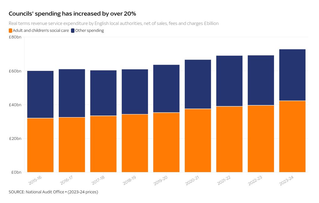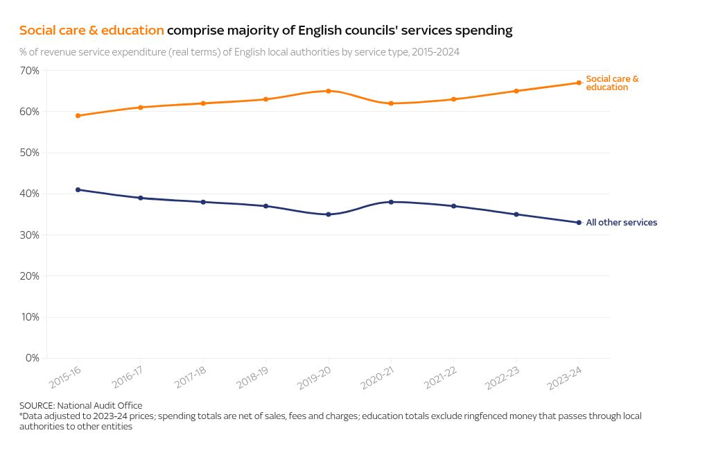 In the latest figures for 2023/24, £3 in every £5 of services spending by English local authorities went towards social care and education, totalling £42.3bn.