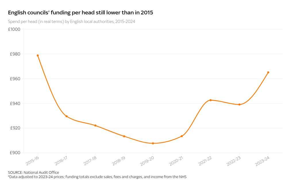 This is a measure of the funding available to local authorities from central government grants, council tax and business rates. Though grant funding has increased in recent years, it has not yet made up for pre-2020 government cuts.