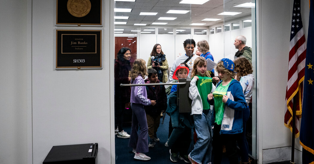 Around 11 a.m., a group of about 10 protesters walked into the office of Senator Steve Daines, Republican of Montana. A staffer asked if any Montana residents were among them, and then directed them to the hallway.