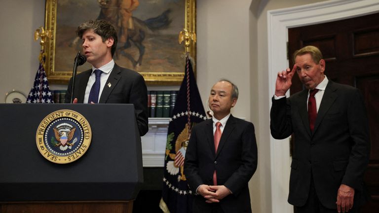 The US president was holding a news conference about a $500bn (£405bn) investment in AI infrastructure in the country, but was questioned about a range of topics.