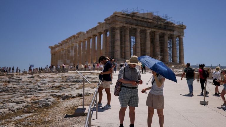 Tourists battle scorching temperatures at the Parthenon in Greece on Friday. Pic: Reuters