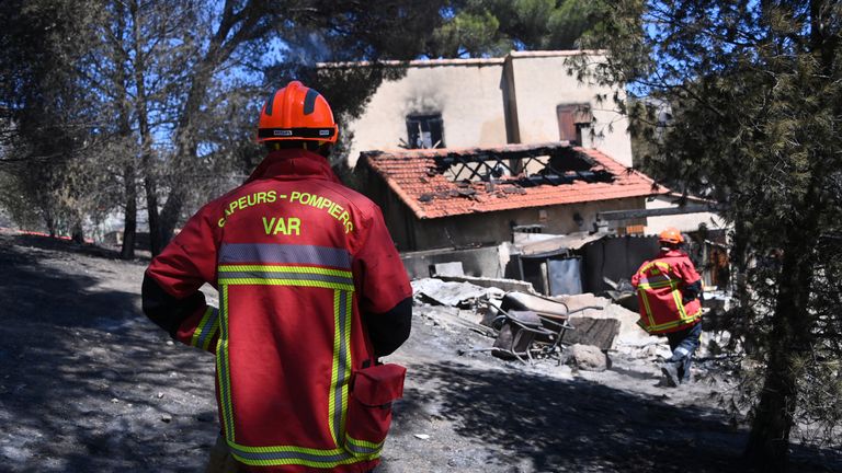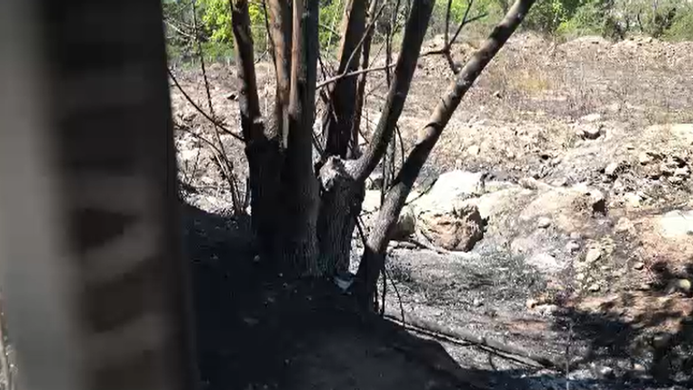 The intensity of the fire has eased, but it’s still active on the edges where there is grass and scrub, tinder dry from weeks of scorching heat and not a drop of rain. A smell of smoke lingers in the air.