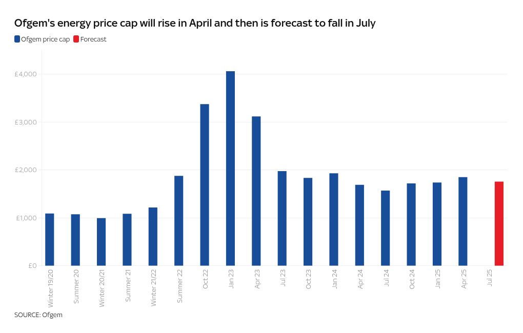 Analysts at Cornwall Insight predict the average energy bill will fall by £93 from £1,849 to £1,756 in July, which is still £18 above the current price cap.