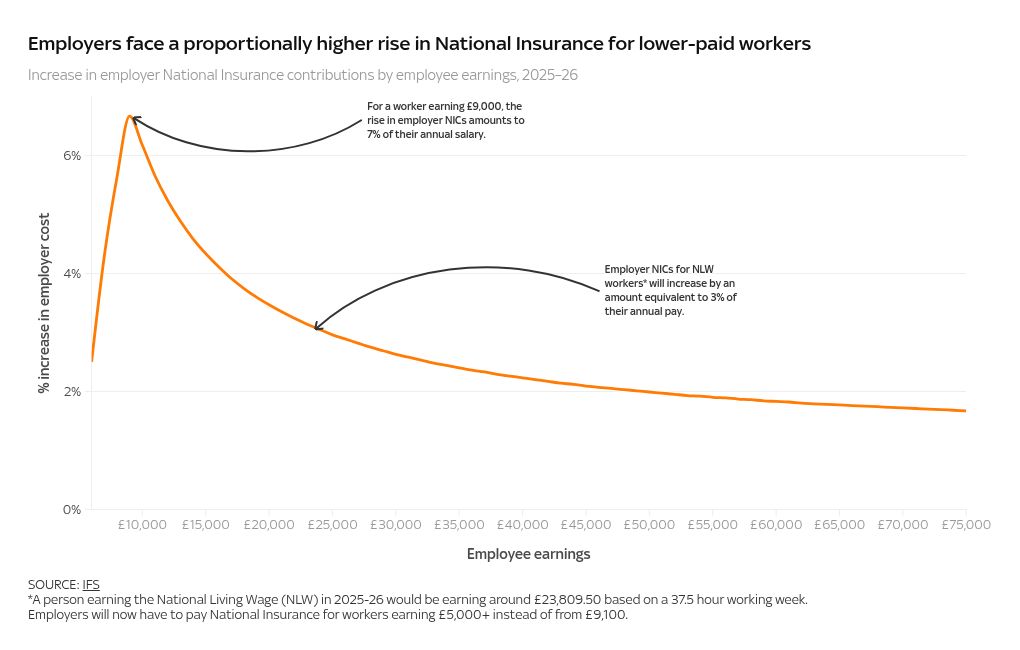 The rise in NICs will be proportionally higher for employers of lower-paid workers. For example, they will pay around 7% for someone earning £9,000 a year and 3% for an employee on the NLW. But for someone earning £75,000 a year, employers will pay 2% more.