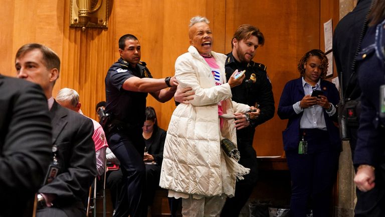 His hearing was interrupted multiple times by protesters, and he was attacked by the top Democrat on the committee, who told him: “You lack the character and composure and competence to hold the position of defence.”