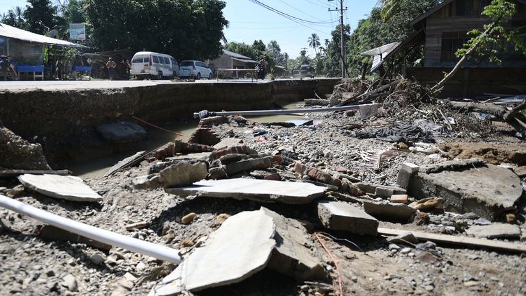 Image: A road heavily damaged by a flash flood in Bireun, Aceh province, Indonesia. Pic: AP