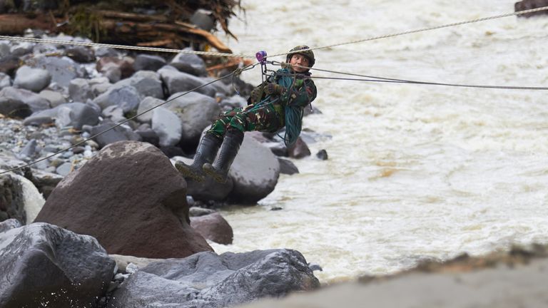 Image: A soldier uses ropes to cross a river during a search operation in Tanah Datar, West Sumatra, Indonesia. Pic: AP