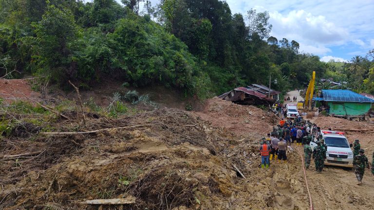 Rescuers search for victims at the site of a landslide in Adiankoting, North Sumatra, Indonesia. Pic: AP
