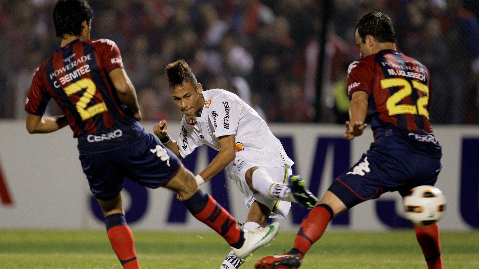 FILE – Brazil’s Santos’ Neymar, center, kicks the ball to score as Paraguay’s Cerro Porteno’s players Cesar Benitez, left, and Mariano Uglessich fail to block during a Copa Libertadores soccer game in Asuncion, Paraguay, Wednesday, June 1, 2011. (AP Photo/Cesar Olmedo, File)