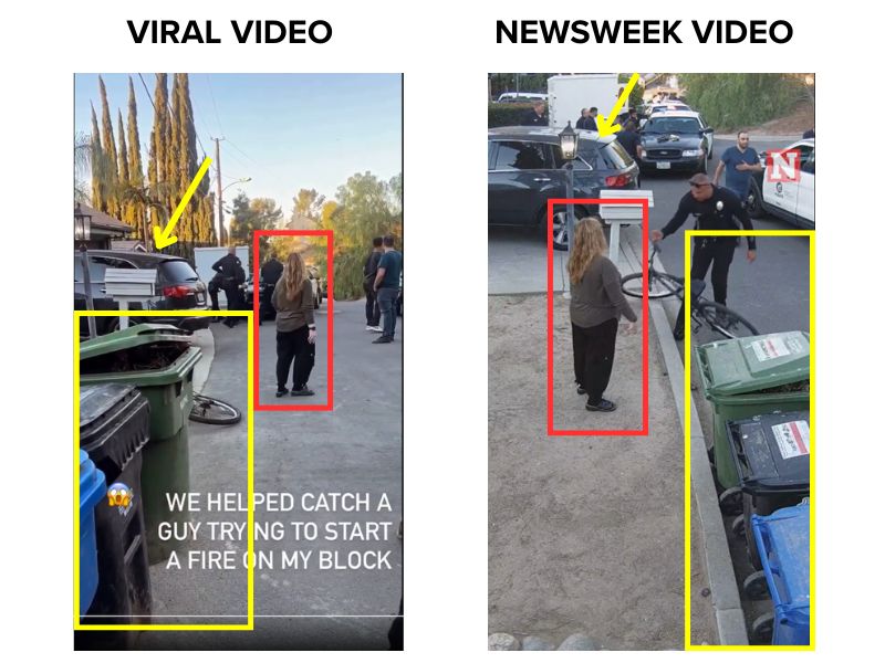 In addition, both the viral and the Newsweek footage showed similar blue, black, and green garbage cans, as well as an individual wearing grey and black attire with long hair and a bicycle on the road.