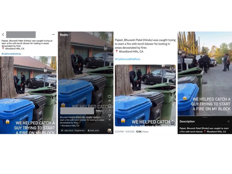 The video has a text overlaid on it, which reads, “WE HELPED CATCH A GUY TRING TO START A FIRE ON MY BLOCK.” It has surfaced on multiple social media platforms, including X, Facebook, YouTube, and Instagram. An X user posted this video with the caption, “Pajeet, Bhuvesh Patel (Hindu) was caught trying to start a fire with torch blower for looting in areas devastated by fires Woodland Hills, CA.” At the time of writing this check, the post had amassed over 132,000 views and more than 1,000 shares. Archived versions of this and other similar posts can be found hereherehereherehereherehere, and here.