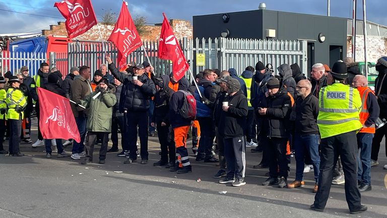 Police officers on hand as members of Unite go on the picket line at Birmingham City Council's Atlas Depot in Tyseley, Birmingham. Nearly 400 council bin workers in Birmingham have walked out indefinitely as part of an escalating dispute over jobs and pay. The Unite union has warned bin disruption in the city could stretch into the summer after refuse workers voted in favour of extending their strike mandate over the council's use of temporary labour to "undermine" their industrial action. Pictu