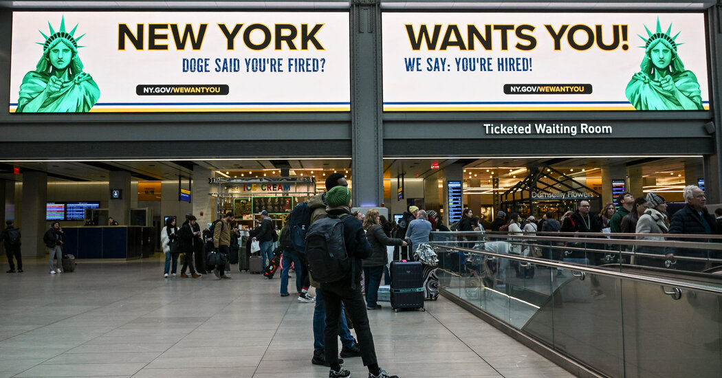 Gov. Kathy Hochul of New York launched an ad campaign targeted at federal employees last week. “We won’t denigrate you. We will treat you with dignity and respect that you deserve because, in New York, we know it’s not the demagogues and the technocrats who make America great, it’s public servants,” she said in a statement.