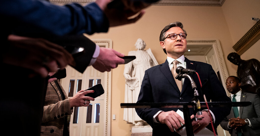Speaker Mike Johnson read directly from a White House press statement during a news conference on Capitol Hill, and rejected the notion of firing Michael Waltz, the national security adviser, who had set up the group chat and included Jeffrey Goldberg, the editor in chief of The Atlantic.