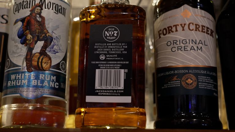 On the shelves where Kentucky bourbon would usually be there are signs saying: “Buy Canadian Instead.”