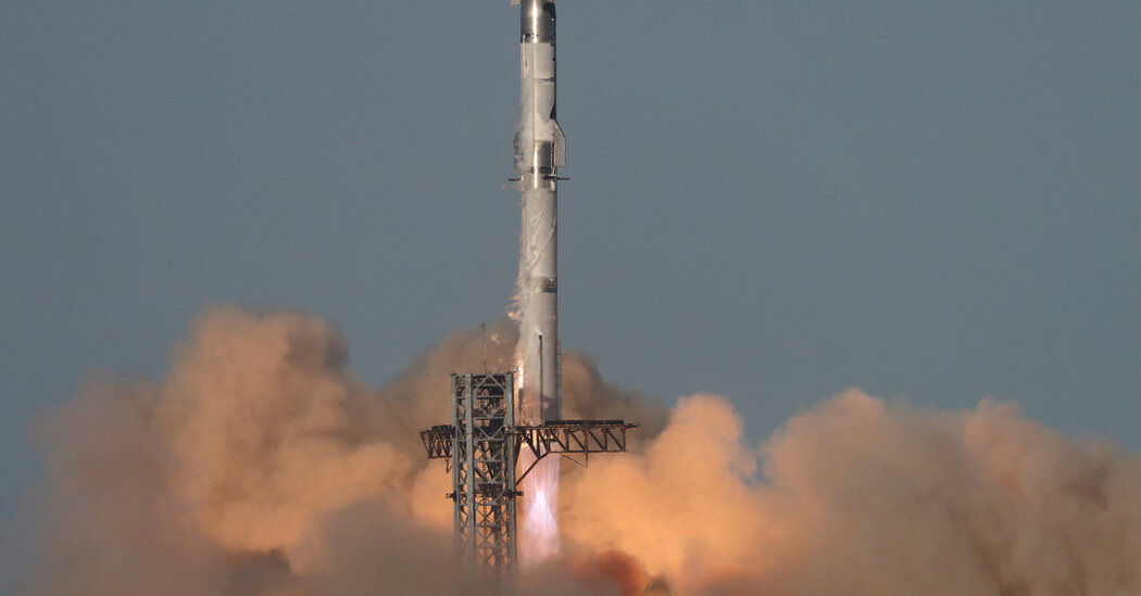 On Thursday, Starship’s mammoth booster, or the bottom of the rocket, again successfully returned to the launchpad, just as it had during the previous test flight. It was the third successful catch of the booster by large mechanical arms on the launch tower that are nicknamed “chopsticks.”