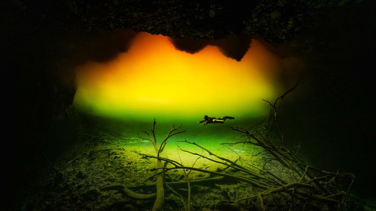 His entry, titled Underwater Aurora, shows a diver in the waters of a cenote sinkhole in Mexico.