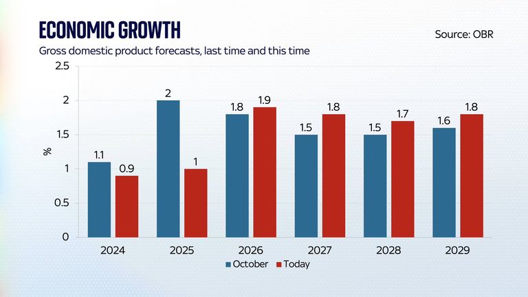 The OBR expects output to grow 1% in 2025, by 1.9% next year, 1.8% in 2027, 1.7% in 2028 and by 1.8% in 2029.