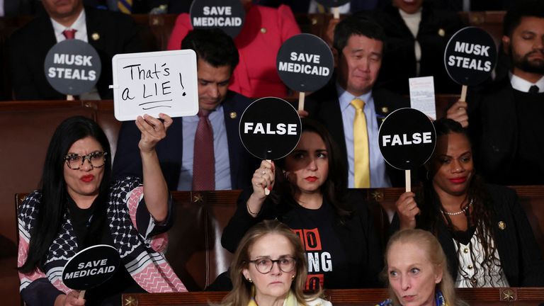 The president made exaggerated claims about alleged government abuse Mr Musk and his team had uncovered – prompting Democrats to wave signs reading “false” and “Musk steals”.