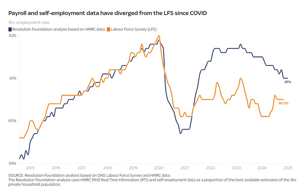 Resolution Foundation analysis shows that HMRC payroll and self-employment data aligned with LFS estimates before 2020 but after the pandemic began to diverge.