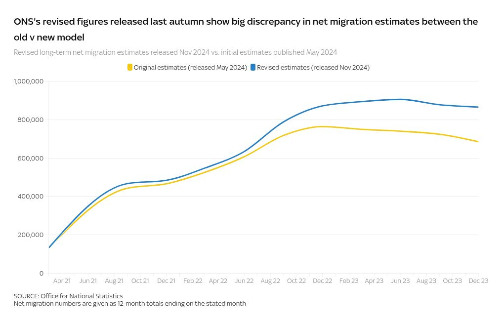 Now, the ONS has shifted to using visa records, higher education statistics, and tax data to provide a clearer picture. Under this new method, it has become clear that net migration has been much higher than previously thought, peaking at 906,000 in June 2023.