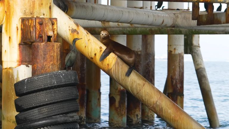 From the beach, where surfers lay out alongside tourists and dog walkers, you can see Platform Esther, a hulking oil rig built in 1965 that ceased production in August this year. Sea lions hug the metal pillars on the rig and dozens of birds perch on the platform.