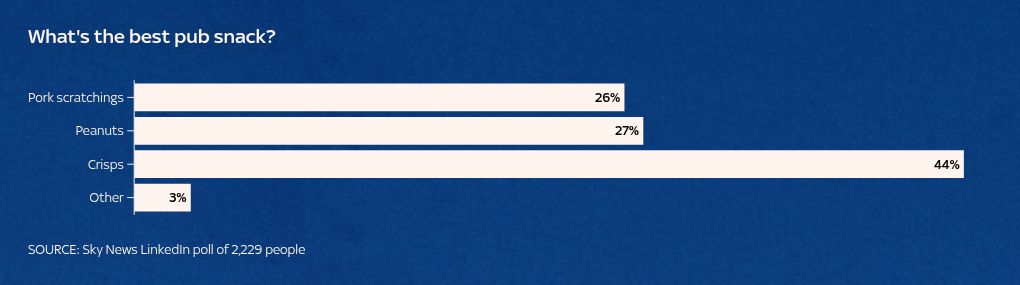 A Sky News survey on LinkedIn found that crisps of any flavour are the best pub snack (44%), followed by a closely fought race between peanuts (27%) and pork scratchings (26%).