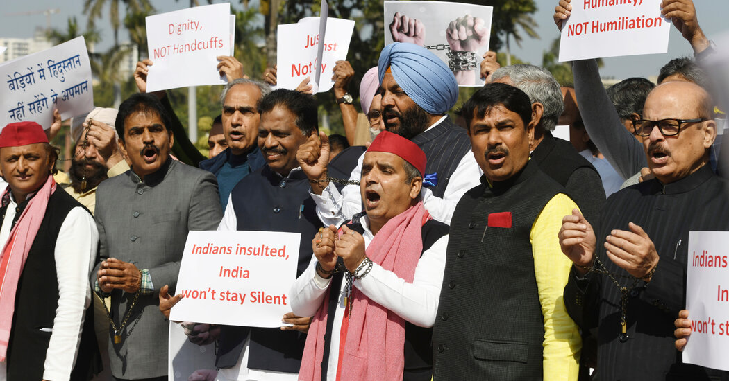 On Thursday, opposition lawmakers staged a protest in Parliament, some wearing handcuffs and carrying signs that read “humans, not prisoners.” They demanded to know how many Indians in the United States were facing imminent deportation.