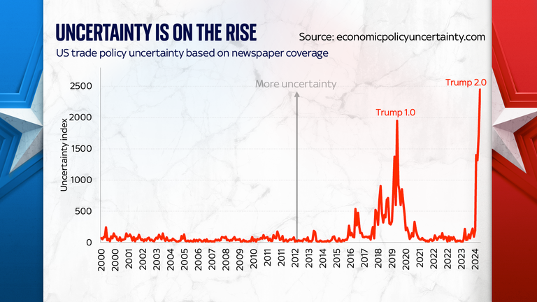 One measure of “policy uncertainty”, which measures how much certain issues are dominating news coverage, shows that the uncertainty levels over trade are currently higher than they’ve been in decades.