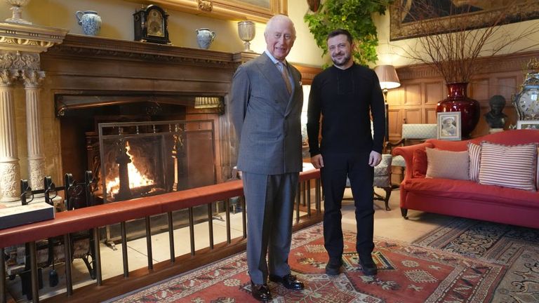 Pictures released after the meeting show Charles and Mr Zelenskyy shaking hands by the entrance to the royal home. The pair chatted briefly before heading inside, where they posed for more photographs.
