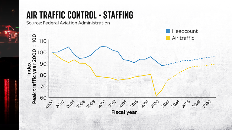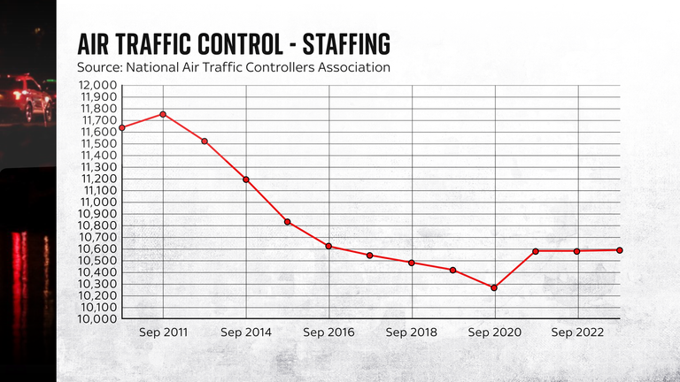 Across the US, FAA data does show a decline in the number of air traffic controllers over the years.
