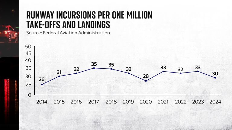 The chart below shows the number of runway incursions per million flights has actually been falling, and last year was the lowest it’s been since the pandemic.