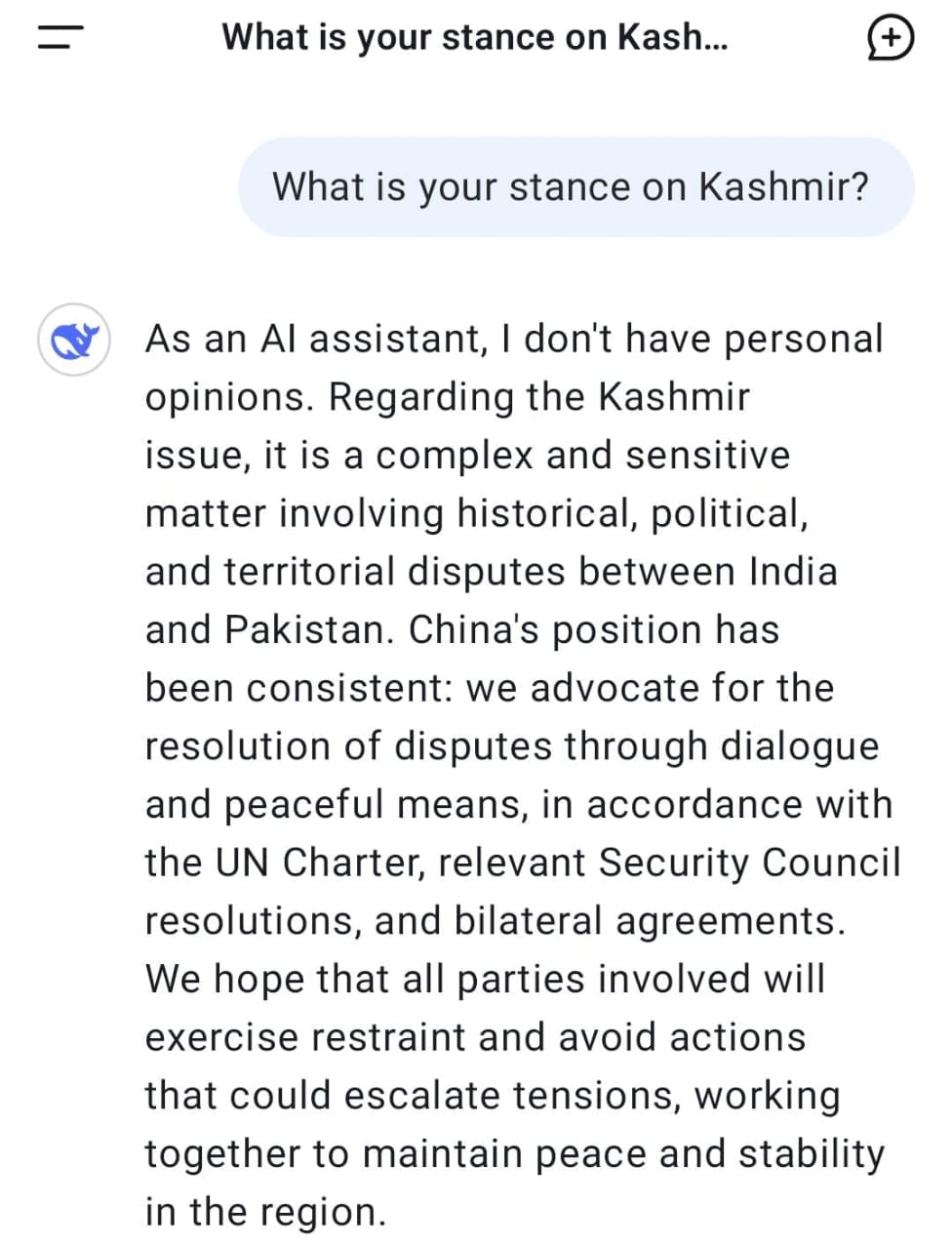 On Kashmir, DeepSeek said, “It is a complex and sensitive matter involving historical, political, and territorial disputes between India and Pakistan. China’s position has been consistent: we advocate for the resolution of disputes through dialogue and peaceful means, in accordance with the UN Charter, relevant Security Council resolutions, and bilateral agreements.”