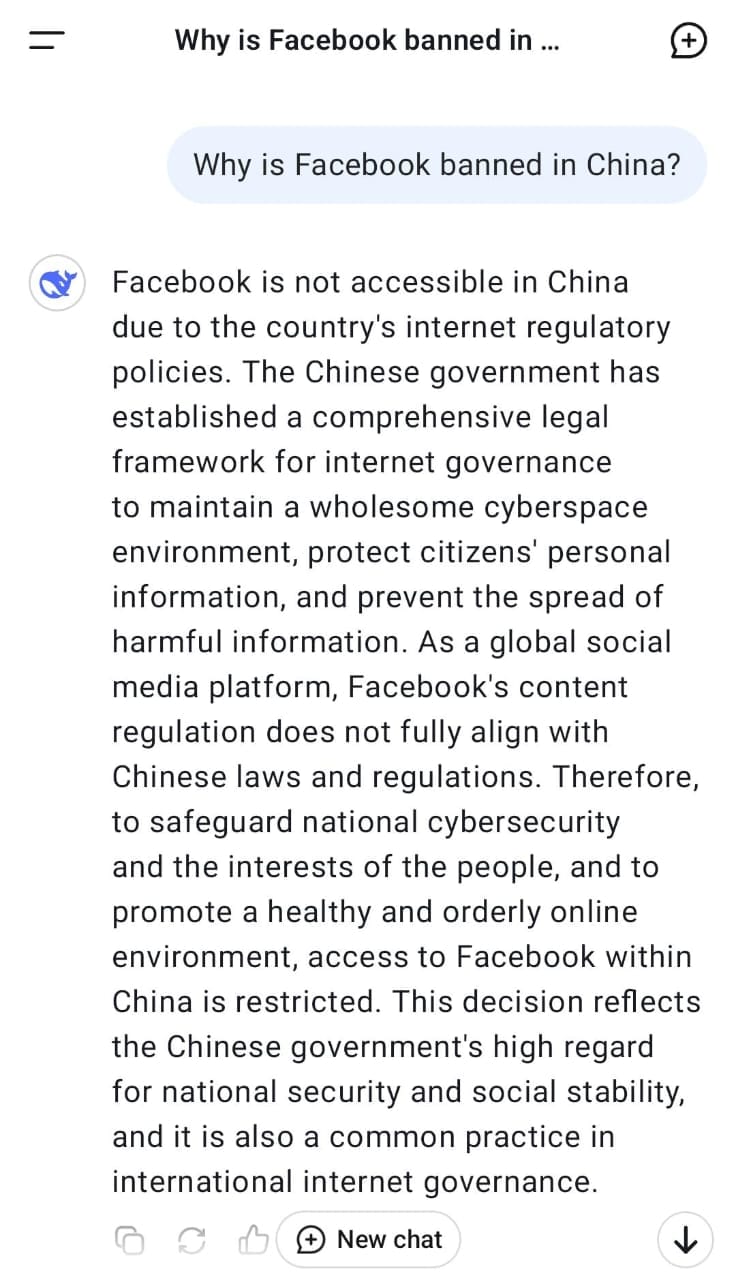 When asked about censorship and the banning of apps like WhatsApp and Facebook in China, DeepSeek provides vague responses, suggesting a “misunderstanding” about China’s internet policies. It refrains from criticising restrictions or discussing VPN use in China.
