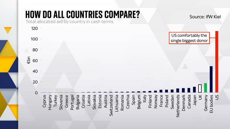 Divide Europe into its constituent nations, on the other hand, and none of them individually comes anywhere close to the US quantity of aid.