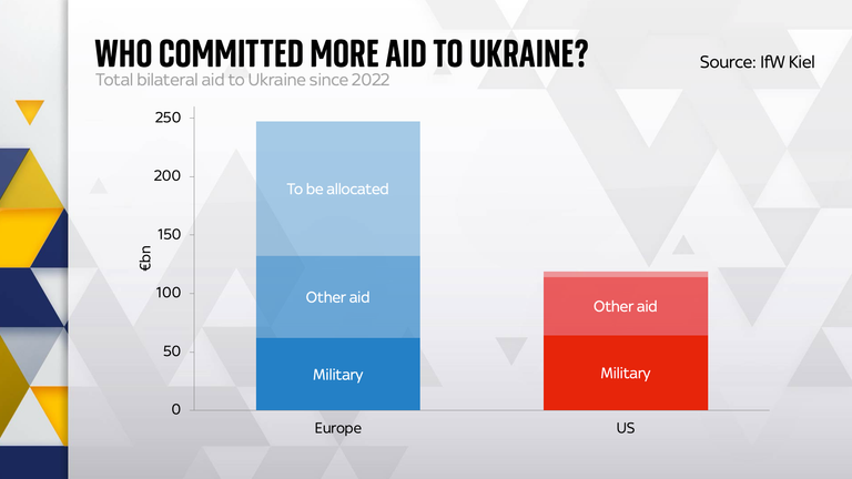 If you’re looking solely at the amount of military support extended since 2022, the US has provided €64bn, compared with €62bn from European nations (including the UK).